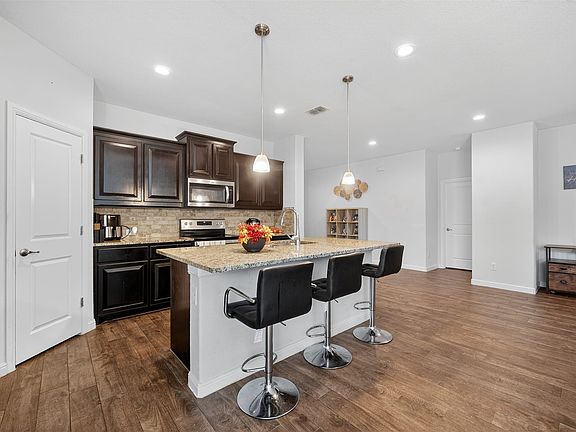 The open-concept layout seamlessly connects the spacious living room, dining area, and kitchen—perfect for everyday living and entertaining alike. The gourmet kitchen is the heart of the home, designed for both style and functionality. Dark espresso cabinetry offers dramatic contrast while plenty of granite countertop space and a large center island with breakfast bar make cooking and gathering effortless. Stainless-steel appliances, modern pendant lighting, and a view into the dining room and backyard complete the picture.