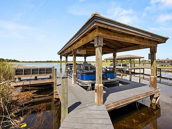 OFFERED with a 2021 LOWE PONTOON BOAT! Lakefront Luxury in Waterleigh with Private Dock and Fireworks Views. Welcome to the perfect blend of comfort, function, and lakeside living in the highly sought-after Waterleigh community. This spacious home sits on a fully fenced 1/3-acre lot with over 100' fronting the lake in the back and 90'+ of open green space to the side; featuring a private dock with low-maintenance composite boards, a pontoon boat lift, and a peaceful sitting area—offering a front-row seat to nightly Disney fireworks from your dock or living room. Inside, no detail has been overlooked. The home boasts durable wood-look tile downstairs and luxury vinyl plank flooring upstairs—no carpet in sight. The open-concept layout seamlessly connects the kitchen, dining, and family rooms, all with stunning lake views. The kitchen is a chef’s dream, complete with 42” cabinets, a 4-seat island, 5-burner stove, double convection oven, butler’s pantry, walk-in pantry, and built-in wine rack. The extra-large primary suite is located on the first floor and showcases crown molding, tray ceiling, huge walk-in closet and serene lake views. The primary bathroom is a dream with quartz counters, dual vanities, a makeup counter, and a walk-in double shower. Upstairs, a versatile loft offers the ideal space for a game room, media room, or second living area. All bedrooms are generously sized with walk-in closets, and there’s no shortage of storage with additional closets throughout. Work from home in the dedicated office, enjoy surround sound in the family room (pre-wired for 5.1), and take advantage of the spacious laundry room with built-in cabinetry and counter space. The 3-car garage features epoxy flooring, and the home is pre-wired for a pool if you wish to expand your outdoor living. Waterleigh offers unmatched amenities including resort-style pools, playgrounds, sports fields, fitness centers, and even a Publix right at the entrance. Lawn, landscape and irrigation maintenance are included with the HOA dues, and you're just minutes from the 429, Disney, shopping, dining, and top-rated schools. This is Florida living at its best.