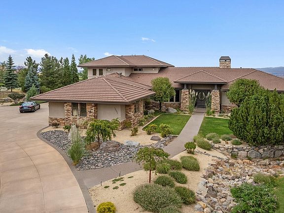 Offering the elegance & attractiveness of contemporary style, this 4-bedroom, 3.5-bathroom is located on the most desirable 1.48 acre lot in the gated Arrowcreek community. The surrounding area, South Suburban Reno, is highly regarded. The home is convenient to shopping, schools & dining options. Experience the best views in Arrowcreek from every window of the mountains, the beautiful pond at hole 10 of the Legends golf course, panoramic city views & the fabulous clubhouse. Luxury golf course living!, Exterior includes a large, inviting covered patio area with barbecue, breezy front porch, and deck off of the upstairs game room. There is a shaded area at any time of the day to relax and unwind. Both the front and back yards are creatively landscaped for full enjoyment. Cross the threshold into a warm welcome that includes an impressive entryway that offers instant views, mahogany hardwoods in the kitchen and traffic areas, an open layout, natural light, stylish fixtures, neutral decor, coffered ceilings, and two gas fireplaces (living room and game room). The kitchen -- stylish and spacious -- offers practical functionality in an efficient layout with double ovens, convection oven (instead of microwave), wine refrigerator, dishwasher, trash compactor, large island with gas cooktop and telescopic downdraft, walk-in pantry, a breakfast bar and more than ample counter space. This gourmet kitchen charms with possibilities. The area adjoining the kitchen can be used as a cozy family room or a breakfast nook. The serene main-floor primary bedroom includes a walk-in closet and private bath with separate garden tub and walk-in shower. There is also a slider that leads to the patio and offers stunning views of the pond and golf course. Off the primary bedroom/bathroom is a sun room/meditation room that is filled with natural light and peaceful vibes. The entire downstairs is heated with radiant floor heat as well as the garage. The secondary bedrooms are all good size, two of which are en-suite and the 4th bedroom is used as an office. The sizable and comfy game room has a gas fireplace, built-in bar and slider that leads to a deck and offers the best views in Arrowcreek. There is a bonus room off of the game room that is great for storage or many other options. There is an attached over-sized-4-car garage. The circular driveway is grand with room for multiple vehicles and toys. There is much more to this home. This one is the right house at the right time for you.