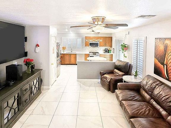 Open-concept layoutElegant window shuttersCorner homeTile flooringNewer vinyl flooringCeiling fan