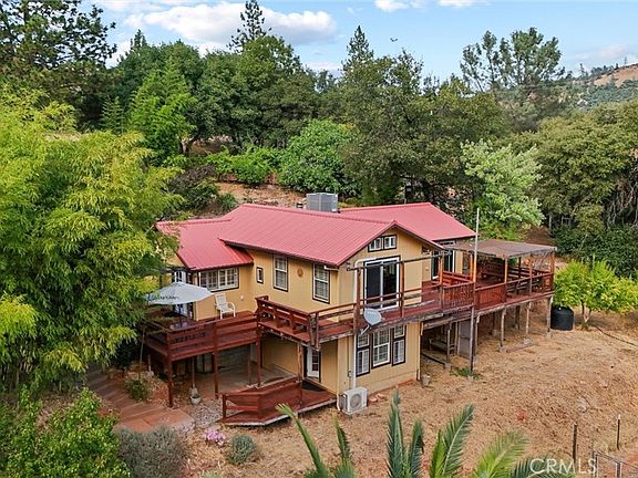 40-Acre Foothill Retreat with Two Homes. Overlooking Lake Oroville in Yankee Hill, this property blends privacy, natural beauty, and convenience. Located in the “banana belt” below the snow line, you’ll enjoy a mild climate just 20 minutes from Oroville or Paradise and 35 from Chico. A private electric gate leads to the 2,179 sq. ft. main home, originally built in 1930 and expanded in 1984. It features Southwest flair, open-beamed ceilings, plantation shutters, and a cozy wood-burning fireplace. The gourmet kitchen includes stainless appliances, wood cabinetry, a restaurant-grade gas stove, butcher block island, and ample prep space. The primary suite opens to a private deck and features a walk-in closet and luxurious en-suite bath with dual sinks, soaking tub, and tiled walk-in shower. There are two more bedrooms, a versatile bonus room for a gym or second living area, indoor laundry, newer HVAC, tankless water heater, and a wraparound deck. Nearby, the 800 sq. ft. ADU offers modern comfort and privacy with Corian/quartz countertops, luxury vinyl plank flooring, fireplace, private kitchen, and full bath. It has its own well, septic, and electric meter—ideal for extended family, guests, or as a rental. The grounds include two wells with solar pumps, three water storage tanks, and artesian spring rights for self-sufficiency. Two seasonal creeks cross the land. Additional structures: 800 sq. ft. detached garage with art studio, She Shed-style cottage, well house, and storage buildings offer space for creative and practical needs. For sustainability, there’s a greenhouse, raised beds, chicken coop, and a large orchard with mature trees: peach, cherry, apricot, plum, apple, orange, mandarin, lemon, fig, loquat, pomegranate, and blackberries. With certified organic history and no chemical pesticides, it’s ideal for a family farm, homestead, or boutique ag venture. Surrounded by wildlife and sweeping Northern California foothill views, this property offers endless possibilities—whether as a farm, multi-generational compound, or peaceful retreat. A rare chance to create your dream lifestyle close to town.