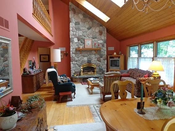 104 feet of Rinehart Lake water frontage! 3.80 acre wooded parcel. 3 bedroom 2 bath custom one owner home with a fantastic view of the water. Large stone, gas fireplace, eat in kitchen with additional separate dining, volume ceilings, second story water views, skylights, master bath, walk in closet, large bedrooms, full, dry basement, deck off dining area wraps around back of home. Steel roof , updated water heater, softener and pressure tank, main level laundry.