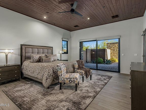 Golf Membership Available - Fully furnished, stunning open-concept home. Modern style with 3 ensuite bedrooms in the home & another bedroom & bath in casita. This home provides all amenities a discerning homeowner seeks. Custom waterfall at entry welcomes you, planked wood ceilings in living room & unobstructed views to the covered patio, where just beyond is a pool & spa. Floor-to-ceiling glass doors in the living room fully retract & allow full enjoyment of the Arizona indoor/outdoor lifestyle. Entertaining is a delight with an outdoor kitchen & fireplace. Tile floors throughout for easy maintenance & abundant storage space can be found in three separate storage rooms. Never worry about heat while puttering in the three air-conditioned garages, perfect for car enthusiasts. Desirable Desert Mountain community