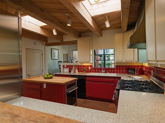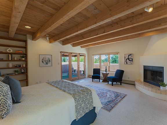 The spacious kitchen with bold cabinetry and breakfast nook flows into formal and informal dining areas, while outdoor courtyards and shaded portals extend the living experience under Santa Fe’s skies. The main suite offers a fireplace, sitting area, built-ins, and a private balcony, creating a true retreat within the home. With three bedrooms and three baths, there is ample flexibility for an artist’s studio, library, or serene guest quarters.