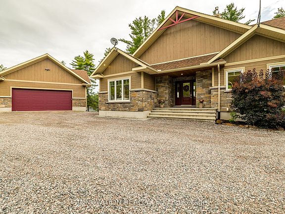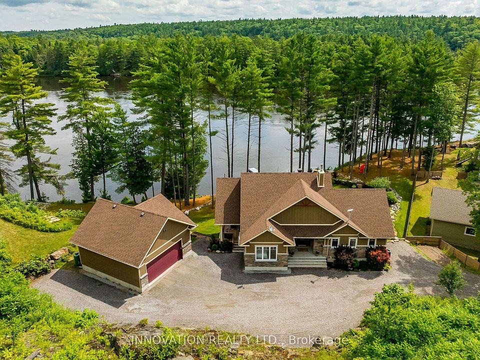 Discover a rare and refined estate on the tranquil banks of the Ottawa River. This custom-built 2019 bungalow offers 4 bedrooms, 3 bathrooms, and over an acre of landscaped privacy surrounded by towering pines. Designed for both comfort and elegance, it's a retreat where luxury and nature meet. Inside, soaring vaulted ceilings and expansive windows frame panoramic river views, filling the open-concept living space with natural light. The chef's kitchen boasts high-end appliances, a generous island, a walk-in pantry, and a reverse osmosis system, ideal for everyday living or hosting with style. The primary suite is a true escape with serene river views, balcony access, and a spa-inspired ensuite featuring a glass shower, deep soaker tub, and dual vanities. A second main-floor bedroom adds convenience, while the walkout lower level offers radiant floor heating, two more bedrooms, a custom recreation space, and direct access to the backyard. Even the laundry room impresses with granite counters, built-in hampers, and soft-close cabinetry. Modern comforts include motorized blinds, programmable thermostats, central air, a Lifebreath air exchanger, and a full HD security system. A detached oversized heated garage provides ample storage and workshop space. Outdoors, the property transforms into a private oasis. Relax year-round in the screened spa lounge with hot tub, gather around the fieldstone fireplace, or head to the floating dock for boating, kayaking, and exceptional fishing, truly a fisherman's dream. Additional perks include an irrigation system, cedar kayak rack, and a charming hobby garage. Every detail has been thoughtfully crafted for ease and enjoyment. This is more than a home, it's a lifestyle.