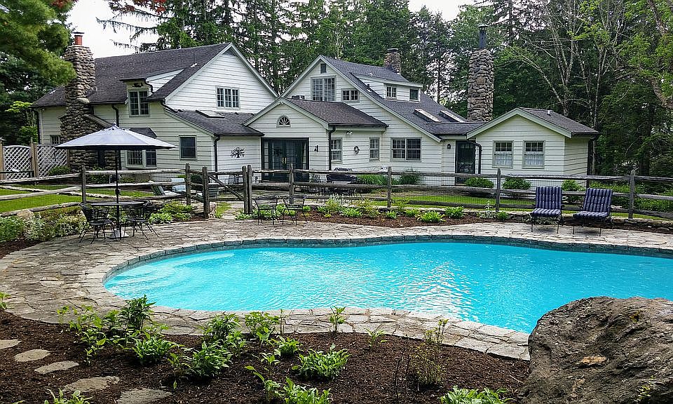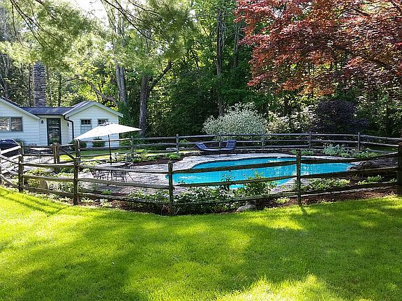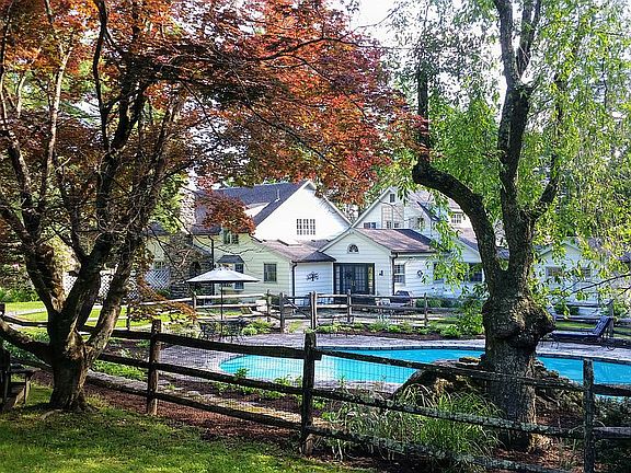 CIRCA 1850 CONVERTED BARN - Remarkable marriage of 2 antique barns. Handsome shingle & stone exterior coupled w/an intriguing interior. 3990 sq ft of finely finished living space brimming w/period detail. Wide-board flrs, 3 floor-to-ceiling stone fireplaces & hand-hewn beams. Phenomenal Great Rm w/vaulted, beamed ceiling & fireplace. Fabulous Living Rm also w/fireplace. Formal Dining Rm w/French doors to rear terrace-perfect for indoor-outdoor entertaining. Choice of First or Second Floor Master Suites. Two addtnl Bedrooms plus lower level au pair office suite. Central air & generator. Over two, private, peaceful acres abutting conservation lands. Absolutely gorgeous grounds w/sweeping lawns & old stone walls, majestic Beech, stands of Birch, Weeping Cherry & Cut-leaf Maple. Incredible flowering Wisteria & Rhododendrons. Heated Swimming Pool w/waterfall & lit Sport Court for outdoor enjoyment. Easy access to Scotts Corners, New Canaan, Stamford, Metro North trains & Merritt Parkway.