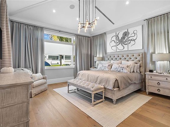 LOCATION, LOCATION, LOCATION! This exquisite custom home is perfectly positioned in the sought-after Gulf Shore Drive section of Vanderbilt Beach, within the exclusive Conners neighborhood. Just one house away from Gulf Shore Drive, it sits on desirable Bayview Avenue directly across from the beach, offering the ultimate coastal setting. Built in 2020, this coastal masterpiece blends modern elegance with timeless craftsmanship. The thoughtfully designed open floor plan with soaring volume ceilings creates an airy, light-filled environment ideal for both relaxation and entertaining. The luxurious ground-floor primary suite is complemented by three additional en suite bedrooms, providing comfort and privacy for family and guests. A dedicated study and sophisticated open kitchen with a large island enhance functionality and style. The home also includes a second laundry room conveniently located on the second floor, adding to its practicality. Designed for hosting or simply enjoying the Florida lifestyle, the outdoor living spaces are truly exceptional. The screened lanai and open patio feature multiple seating areas, a built-in grill, outdoor fireplace, and a full outdoor kitchen. The resort-style pool and spa complete this private retreat. For boat enthusiasts, a custom dock accommodates vessels up to 42 feet, offering direct access to the bay and beyond. Impact-resistant doors and windows, a whole-house generator, and electric shutters provide security and peace of mind. A generous three-car garage offers ample space for storage and parking. This remarkable residence represents the best of Naples waterfront living—where luxury, design, and location meet to create the quintessential coastal dream lifestyle. Bonus-in addition, this property offers an opportunity to be part of the newly formed Paraiso Beach Club. Enjoy two beautiful restaurants, multiple pools on the beach and luxury beach living.