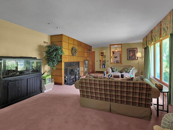 Welcome to this all-brick 2-bedroom, 2.5-bath ranch full of mid-century charm and character. Nestled on a beautiful wooded lot in a quality neighborhood, this home offers great space both inside and out. The spacious living room features one of three fireplaces, with beautiful hardwood floors in the dining room and den. The kitchen is equipped with quality cabinetry, recessed lighting, and a skylight that adds natural brightness, while the separate dining room is perfect for gatherings. Enjoy peaceful mornings or host friends in the large sunroom overlooking the private backyard. The generously sized primary suite includes its own bath with a garden tub, and the partially finished basement adds even more usable space with another fireplace. With great bones and loads of potential, this one is ready for your personal touch.