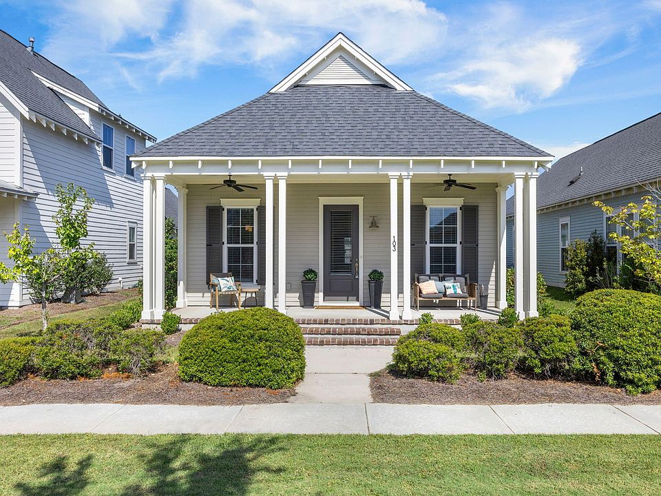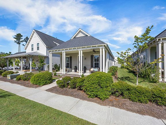 Welcome to this upgraded and inviting cottage-style 3-bedroom, 2-bath ranch home with a large front porch, perfectly situated in Brighton Park, Nexton, one of the Lowcountry's most sought-after communities. The charming porch sets the tone for the warmth and comfort you'll find inside. Step through the front door into an open-concept floor plan where the kitchen, eat-in dining area, and living room flow seamlessly together, ideal for everyday living or entertaining. Sunlight floods the space through numerous windows, creating a bright and airy atmosphere. The kitchen features white cabinets, a timeless subway tile backsplash, a center island perfect for quick breakfasts, a stylish chandelier, stainless steel appliances, and a gas range. Tucked away for privacy, the spacious primary suiteis filled with natural light and offers a double vanity, tile shower, and walk-in closet. Two additional bedrooms share a beautifully appointed guest bathroom. Enjoy warm Lowcountry days on the back patio, and take advantage of the detached two-car garage accessible from both the backyard and the side street for added convenience. Located in the award-winning, master-planned community of Nexton, you'll enjoy access to miles of scenic walking trails, resort-style pools, HOA-maintained green spaces perfect for picnics or play, pickleball courts, community parks, top-rated schools, and a vibrant town center with shops, restaurants, and entertainment. With unbeatable convenience to I-26, Volvo, Boeing, and Historic Downtown Charleston, this home offers the perfect blend of lifestyle and location. Don't miss your chance to make this one-of-a-kind property your own!