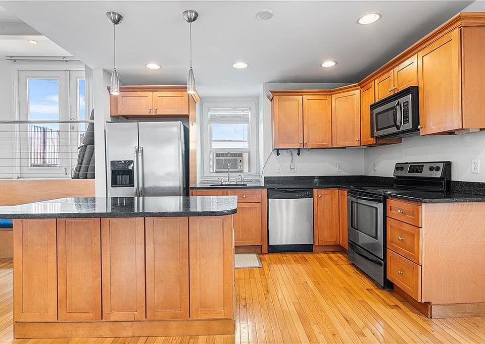 Enjoy captivating sunsets and evening breezes from the private deck of this stylish penthouse condo, ideally located on the East Side of Providence in the sought-after Doyle Avenue Historic District. Set along a picturesque, tree-lined street, this sun-drenched residence boasts a gracious foyer, soaring ceilings, and an airy open-concept layout. The modern kitchen is appointed with granite countertops, stainless steel appliances, and seamlessly flows into a cozy dining nook—perfect for both casual mornings and elegant entertaining. Additional features include gleaming hardwood floors throughout, an oversized tile bathroom with a jacuzzi tub, separate shower, and in-unit washer/dryer. Both bedrooms offer generous closet space, and a built-in office nook provides an ideal work-from-home setup. This pet-friendly building also includes a large basement storage unit, and two tandem garage parking spaces. Just moments from Brown, RISD, Downtown, and the vibrant shops and restaurants that make this neighborhood a perfect blend of historic charm and modern living. *Some photos have been virtually staged.