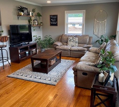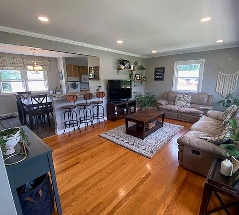 Welcome to this well-maintained and charming ranch-style home, perfect for comfortable family living. The bright and open floor plan features a spacious living room with large windows that let in abundant natural light and features natural hard wood floors. The eat-in kitchen comes equipped with all major appliances and offers ample cabinet space.