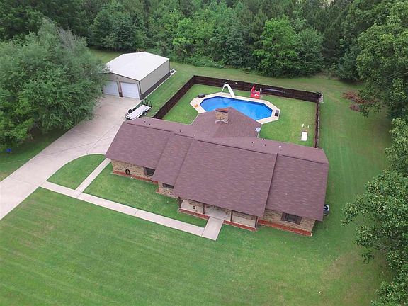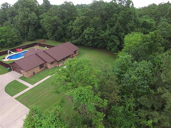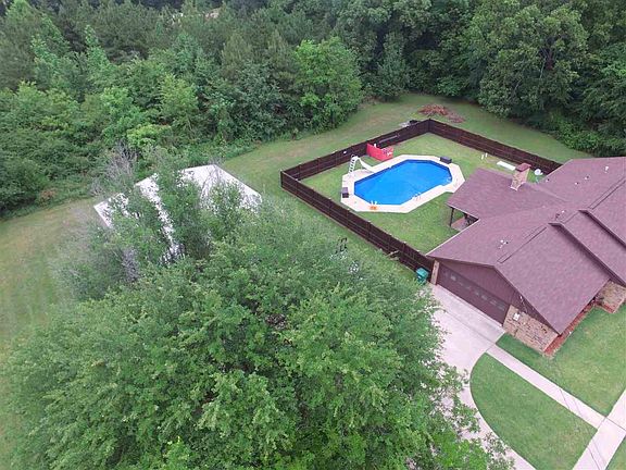 Beautiful home with in-ground vinyl lined chlorine pool, large insulated workshop 36' x 40' with 2 roll-up doors 10' x 12' , extra slab across the back for trailer spot or what have you, shop has its own 200 amp electric service. Vaulted ceiling in den, completely remodeled with pretty cabinets, roll-out drawers, ample pantry, stainless steel appliances, breakfast bar, quartz counter tops, wood burning fireplace covered patio, also an underground shelter in back yard with ventilation in case of tornado warning, manicured lawn. Located at the end of the street for privacy. Features 10.861 acres, with 9.5 acres is trees. This home has that great feeling that says " this is what I have been looking for ", so lets go look.