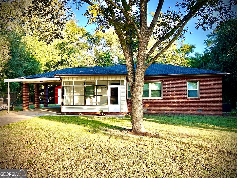 Adorable and affordable. Partially updated --Charming 3 bedroom, 2 bath home in East Dublin on a 0.41 acre lot. This cozy brick home with vinyl accents features a inviting living room perfect for everyday living and entertaining, a dedicated dining room for family meals and gatherings, and a well designed kitchen-- complete with granite countertops and tiled backsplash. Enjoy the inviting glass sun porch at the front of the house perfect for relaxing. Recent updates include a new HVAC system, new hot water heater, and a replaced roof for peace of mind. Outside, you will find a paved driveway, and fire pit area, and a 12X20 workshop with roll up doors, concrete floors, air-conditioning, and dual lean-tos ---ideal for storage, hobbies, she-shed/man-cave. Enjoy the cozy charm inside and a back yard designed for gathering around the fire pit or working in the fully equipped workshop.