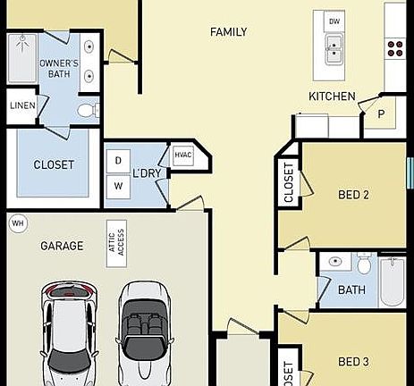 The master bedroom offers a spacious walk-in closet, double vanities, and linen storage. The two additional bedrooms are located on the opposite side of the home, providing privacy for family or guests.