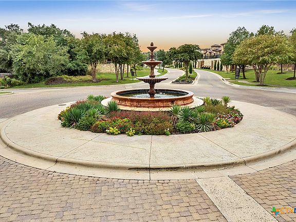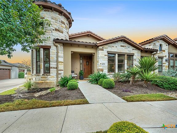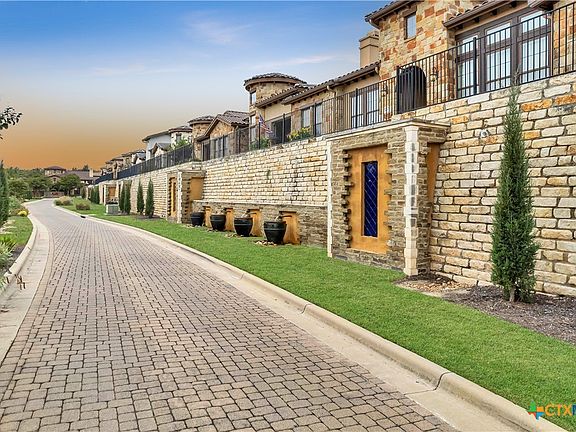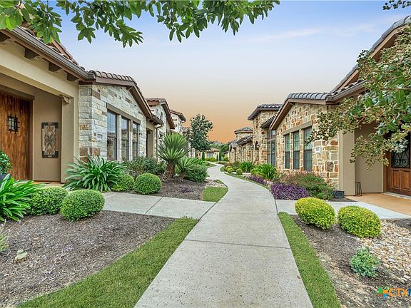 Experience luxurious living in this stunning end-unit townhome nestled within the highly coveted 55+ community of Tuscan Village in the heart of Lakeway. As you enter the community, you'll be welcomed by a grand entrance featuring stunning water fountains and brick streets, evoking the charm of driving through the streets of Tuscany. This residence is perfectly suited for a lock-and-leave lifestyle, offering both comfort and convenience. This beautifully designed home features exquisite designer flooring throughout. A standout feature is the charming curved bay window in the dedicated study. The open floor plan seamlessly connects the living area, dining space, and gourmet kitchen. The living room is highlighted by a stunning stone gas fireplace, adding warmth and ambiance. The fabulous kitchen boasts quartz countertops, custom cabinetry, stainless steel appliances, and designer tile. Fresh paint throughout enhances the home's modern and inviting appeal. The primary suite is designed as a serene sanctuary, featuring a stunning wall of windows that bathe the room in natural light. The sophisticated en-suite bathroom is a spa-like haven, boasting a double vanity with an expansive quartz countertop and a sleek walk-in shower. Step outside to enjoy the private covered patio, complete with a gas grill hookup, making it the perfect setting for dining and entertaining guests. Adjacent to the patio, a cozy private courtyard offers a secure space for pets to roam. The home also includes a spacious two-car garage, providing ample storage and convenient parking. Residents benefit from resort-style amenities, including a pool, fitness center, and clubhouse, alongside a schedule of social activities. The HOA provides extensive coverage, including cable, internet, landline, landscaping, and exterior maintenance. This home combines luxury and convenience, offering a low tax rate and ideally situated near Lakeway's library, shopping, dining, and hospitals.