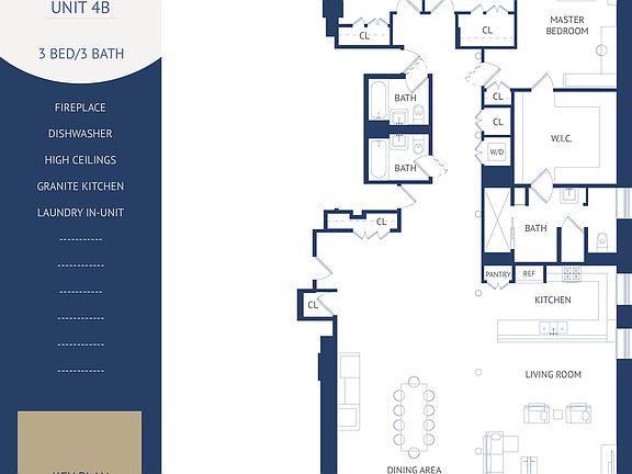 The primary suite is positioned on the opposite end of the apartment for maximum privacy and includes an oversized dressing room and a luxurious en-suite bathroom. Two additional spacious bedrooms and two full bathrooms provide ample space for family, guests, or a home office setup. A full-sized washer/dryer is also in-unit for added convenience.