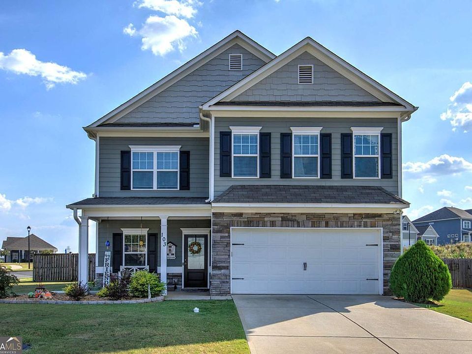 Welcome home to this stunning 4-bedroom, 2.5-bath residence! Perfectly designed for family living, the spacious open-concept layout offers a beautiful kitchen with abundant cabinetry, gleaming granite countertops, a breakfast bar, and a cozy breakfast area that flows seamlessly into the living room with a fireplace. A versatile formal dining room also works perfectly as a home office. There is also a half bath on this main level for your guests. Upstairs, you'll find four generously sized bedrooms and two full baths. The oversized primary suite features a spa-like ensuite bath and a huge walk-in closet complete with a professionally installed organization system. Step outside to a fully fenced backyard with a privacy fence, covered porch, and an expansive concrete patio-ideal for outdoor entertaining. Just a short walk to the community pool and amenities, this home is also conveniently close to schools and shopping yet tucked away in a setting that feels both peaceful and inviting.