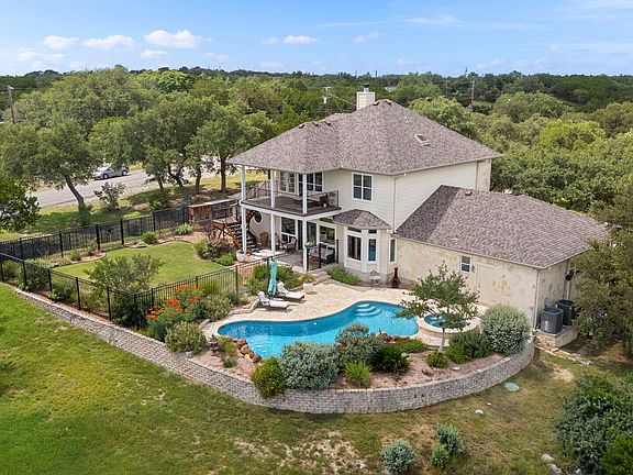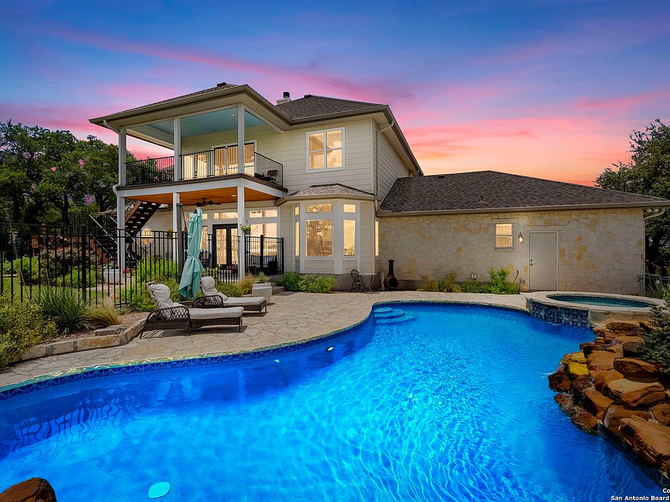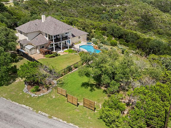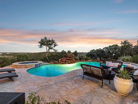 Nestled atop a scenic bluff in the coveted Deep Hollow at Tapatio Springs, this exceptional 3,310-square-foot residence offers an unparalleled blend of Hill Country beauty and refined living. Situated on 3.34 private acres at the hill's summit, the home captures sweeping 180-degree views and is thoughtfully designed to harmonize with its tranquil surroundings. Inside, a grand entryway opens to a luminous, open-concept living space anchored by floor-to-ceiling windows and a charming wood-burning fireplace. Four spacious bedrooms-including a serene first-floor primary suite-are complemented by three and a half baths and a versatile flex room, complete with a private balcony to take in the breathtaking vistas. Every detail has been elevated with carefully curated upgrades, including a professional-grade gas range, stunning Everest White Exotic quartzite countertops, artisan copper sinks, and elegant porcelain tile patios that invite seamless indoor-outdoor living. The backyard oasis features upper and lower patios and a sparkling hillside pool and spa-an ideal setting for relaxation or entertaining under the expansive Texas sky. The property is beautifully landscaped with a fenced area for easy care, while the surrounding acreage offers room to roam freely-all with no HOA restrictions. Tucked away on a peaceful cul-de-sac, yet just minutes from downtown Boerne, this home offers both seclusion and convenience. A rare offering that embodies the essence of Hill Country living, this is more than a home-it's an elevated lifestyle.