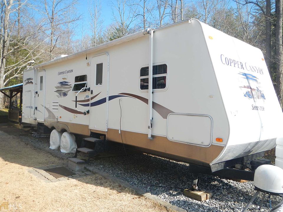 Beautiful lot at the base of Yonah Mountain located in an RV park. Will sell without the camper for 40,000. Lot has full hookups on both side of the lot. Plenty of parking for your vehicles. Large lot with a storage building for extra full bath and laundry. Covered pavilion for your cookouts. A special made fire pit with a large back yard to enjoy the outdoors. Backs up to the greenbelt