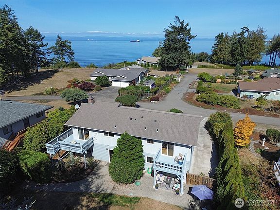 Island View Estates 3BR/3BA home on a 0.22-acre lot on a quiet, dead-end street. Mature landscaping provides privacy, while abundant wildlife and stunning views of the Strait of Juan de Fuca, Mt. Baker, and Victoria, BC offer a daily connection to nature and beauty. Vaulted ceilings, skylights, and wood floors add warmth and character. The upper level includes living and dining areas, kitchen, guest suite, and a spacious primary with private deck and tile-finished en-suite. Downstairs features a large family room with wood stove insert, guest bedroom, ¾ bath, and laundry. Fenced backyard and generous parking. Near the Olympic Discovery Trail. Enjoy dynamic water views with passing ships, pilot boats, and the quiet rhythm of maritime life.