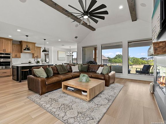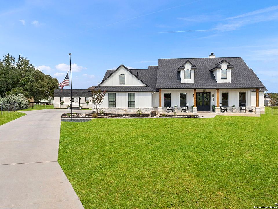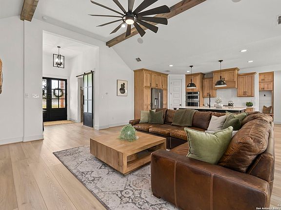 * 5.12 VA Assumable Loan *Ask about a Preferred Lender Credit* Welcome to a beautifully crafted 4 bed, 3 bath home by Sierra Classic Homes, offering luxury upgrades and modern efficiency in one of the Hill Country's most desirable golf communities. Inside, you'll find an open layout with soaring 10' vaulted ceilings, quartz countertops, custom maple cabinetry with pull-out shelving, high-end Gen Air appliances, and hand-scraped luxury vinyl plank floors. The spacious primary suite features two closets (one with custom built-ins), a soaking tub, and a separate shower. Additional highlights include a dedicated home office, smart thermostat, Ring doorbell, built-in speakers, electric shades, oversized AC unit, and tank less water heater. Outdoor living is just as impressive, with a covered patio wired for TV, ceiling fans, and built-in speakers. The property also features a fully insulated 28x14x14 shed with A/C and heat, keypad entry, and its own breaker-perfect for a workshop, studio, or hobby space. A full irrigation system, oversized garage, and fenced yard complete the package. Living at Rockin J Ranch means access to a community pool, walking trails, pavilion, and the championship Vaaler Creek Golf Club-plus 3 free rounds of golf each month. Conveniently located just 1 hour from both San Antonio and Austin airports, and close to the Fredericksburg wine trail, this home offers the perfect blend of Hill Country charm, resort-style amenities, and everyday convenience.