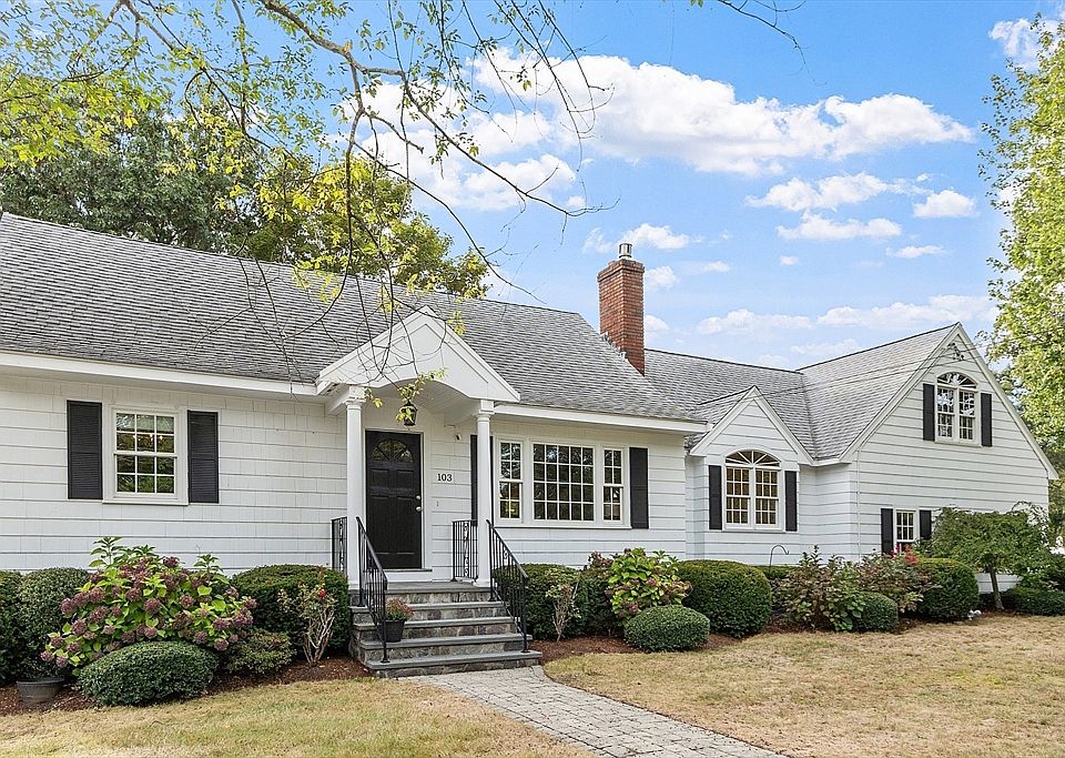 Welcome to 103 Lexington! This charming 4BR, 2BA Cape sits on a private corner lot w/mature landscaping & excellent access to Rt. 3 & I-95. The modern open-concept kitchen features granite counters, soft-close cabinetry w/pull-out organizers, well-placed appliances, recessed lighting & oversized sink. Its large center island w/bar seating invites conversation & opens to the living room w/gas fireplace for added ambiance. Natural light fills the main floor w/row of rear windows & glass slider to rear deck bringing the outside in to enjoy New England's changing seasons all year. A bedroom, full bath, family room, sun room, 3-season porch, laundry closet & office nook complete the main floor. Upstairs are 3 bedrooms, full bath, & extra storage w/ potential for a walk-in closet or ensuite. Attached 2-car garage opens to kitchen/dining area-no hauling groceries! With ladder access to large 2nd floor storage area w/more expansion possibilities. Property comes w/a free 1-year home warranty!