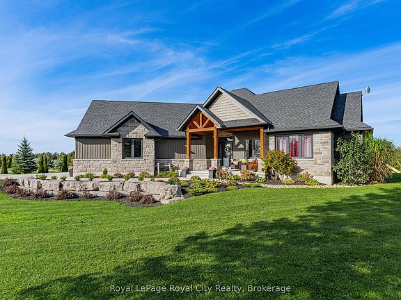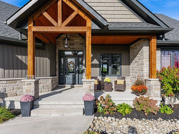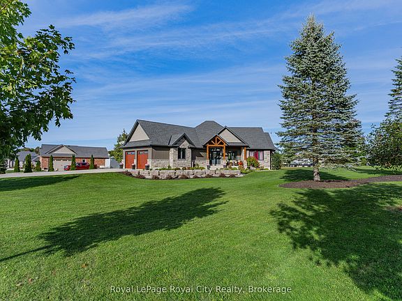Rustic Lodge Charm Meets Modern Living. Welcome to this striking custom-built bungalow, perfectly set on a 1.15-acre corner lot in the coveted Marshall Heights subdivision where peaceful country living meets community convenience. Timber beams frame the inviting front porch and open to a generous foyer, introducing a layout designed for both everyday living and effortless entertaining. At the heart of the home, the great room takes centre stage with its spectacular stone fireplace, perfect for cozy evenings by the fire. The kitchen is a showpiece, featuring an oversized island, finely crafted cabinetry, and thoughtful details that make both casual family meals and festive gatherings a delight. Host holiday dinners in the formal dining room or extend the party outdoors on the deck, complete with a partially covered entertaining space ideal for dining, relaxing, or watching the big game. The private primary suite, tucked into its own wing, offers a walk-in closet, spa-like ensuite, and direct deck access. Two additional bedrooms and a full bathroom are located in the opposite wing, ensuring comfort and privacy for family or guests. Practical features abound, including a powder room, main floor laundry, and an oversized double garage with inside entry. The fully finished lower level expands your lifestyle options with two more large bedrooms, a family room, a flexible gym/office space, a full bathroom, ample storage, and a cold cellar. Outdoors, the expansive yard is full of possibilities. With a large shed, RV/boat parking, and plenty of space for a pool or future workshop, its ready for all your hobbies and dreams. Perfectly situated between Durham and Mount Forest, this home offers year-round recreational opportunities-hiking, ATVing, skiing, snowmobiling, and more, all just minutes away. This isn't just a home it's the lifestyle you've been dreaming of.