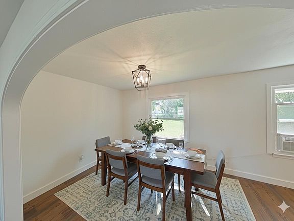 Large mirrorCute vanityCozy front porchLarge backyardUpdated light fixturesDining areaNew carpet