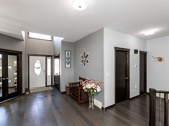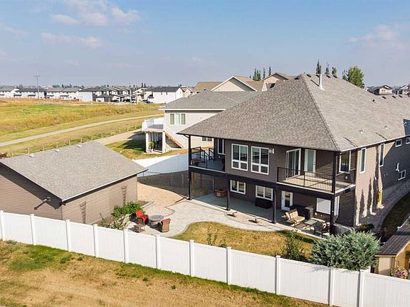Experience luxury living at its finest in this custom-built, over 4,000 sq. ft. fully finished bungalow in Blackfalds! Designed for comfort, style, and entertaining, this home boasts no rear neighbours, breathtaking views, and both a double front attached heated garage plus a huge detached heated garage with alley access and RV parking. Inside, enjoy 9-ft ceilings, triple-pane windows, in-floor heating, and expansive natural light. The main level features a spacious kitchen with walk-in pantry, large island, stainless steel appliances, and separate dining area, plus a luxurious master suite with private deck access, grand walk-in closet, and spa-inspired ensuite with jetted tub and heated tile floors. The living room impresses with a two-sided stone fireplace flowing into the all-season heated sunroom, perfect for year-round enjoyment of the views. The lower level is a true entertainer’s dream, featuring a double-insulated media/studio room, 3 additional bedrooms, and a wet bar with cozy fireplace. With ample storage and direct access to the patio and beautifully landscaped backyard, it’s perfect for hosting gatherings, enjoying summer activities, or letting pets roam freely. Additional highlights include air conditioning, hardwood floors, and a fantastic neighbourhood. This bungalow delivers exceptional craftsmanship and features rarely found in Blackfalds, offering a lifestyle of space, luxury, and convenience.