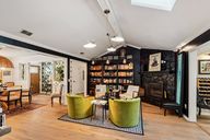 Stone fireplaceQuartz counter topsBuilt in sky lightsEuropean white oak flooringGourmet kitchenTasteful eclectic wall coveringsBuilt in bookshelves