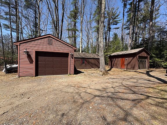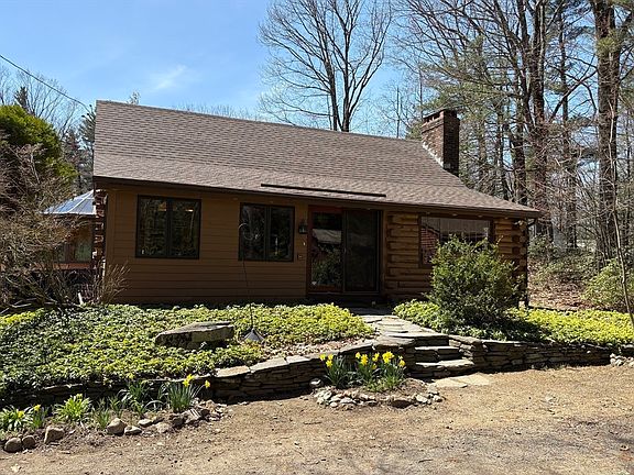 At the top of Petticoat Hill on 2.56 lovely acres offering room for gardens and berry bushes is this modern day log cabin.  Inside, the large open living/dining/kitchen area works well for day to day life or for entertaining.  The living room offers a cathedral ceiling with newer skylights and beautiful stone fireplace.  There is a wonderful first floor main bed and bath suite.  The huge bonus here is the beautiful sunroom addition, a space that lets you feel a part of the outdoors while inside.  The sunroom's propane stove keeps this a space that can be enjoyed year round.  Upstairs are two additional bedrooms, featuring some nice built-ins.  Interestingly this house feels expansive and cozy at the same time.  Back outside there is large multi level deck leading to the inground pool area.  The cleared area around the house brings in sunlight and air, while the surrounding trees offer a sense of privacy.  Two single car garages and two garden sheds complete this wonderful property.