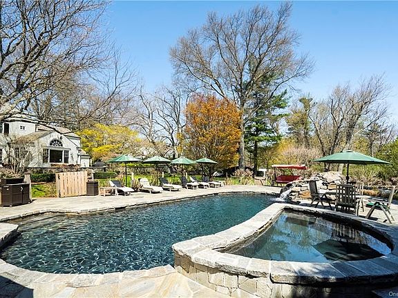 Gracious traditional center hall colonial home with wraparound porch in Sterling Ridge with salt water pool, hot tub, waterfall, bocce court, fire pit, vegetable garden and multiple stone terraces on a parklike manicured 1.1 acres. Beautiful plantings throughout the property with irrigation system. Formal living room with wood burning fireplace, formal dining room with butler's prep with a sink and dishwasher, inviting den with cherry wood built-in entertainment console, stunning library-reading room with mahogany floor to ceiling bookshelves with wet bar with wine refrigerator, chef's kitchen with two large islands and sinks, Sub Zero, Viking and Thermador appliances with 3 ovens and bright eating area, walk-in pantry and mud room. Upstairs includes a sprawling owner's suite with a sitting area and two separate bathrooms (one with steam shower and one with jacuzzi both with heated towel racks) and two separate walk in closets. 4 additional bedrooms and 3 bathrooms on second floor, separate entrance and back staircase to additional 6th bedroom and renovated bathroom, Lower level boosts a large entertainment room with built-in bookcases, a billiard room with wood burning fireplace, large laundry room. Hardwood floors and crown and wall moldings throughout the home. Two car garage, generator, storage shed, alarm and camera system, dog containment system, sound system, basketball hoop, gas BBQ. A perfect house for entertaining inside and out.