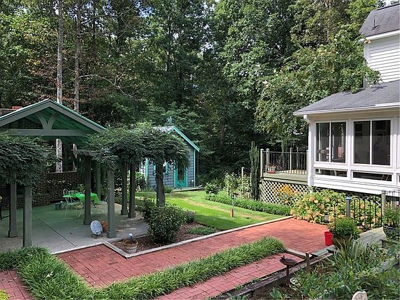 Southern Charm! This farmhouse style home is situated on .70 acres and is within walking distance to the historic town square of Pendleton, where there are restaurants and shopping. The home features an open floor plan with 4 bedrooms and 2 ½ baths, a beautiful sunroom, and a cozy screened porch. The grounds are absolutely astonishing! The retreat-like setting will leave you never wanting to leave home. There are several ways to enjoy the surroundings, whether it is on the screened porch, the wrap-around front porch, or on the amazing covered patio with a built-in fireplace. All of which, are surrounding by pathways leading through the stunning gardens. No matter the season, you will be able to enjoy the outdoors. This home was built in 2003 and has since seen the addition of the sunroom, the covered patio, lots of decking, the potting "shed", and most recently the guest bedroom on the main level with tons of natural sunlight. The upstairs of this home consists of two bedrooms, a large guest bath, and a sitting room, which adjoins the back bedroom. The downstairs features; an open den, dining, and kitchen area and the master bedroom, a laundry area, a pantry, a half bath, and the newly added guest bedroom. The downstairs has hardwood and ceramic tile flooring. Just an FYI, it is difficult to call the adorable building in back a "potting shed". It is NO SHED! I would make it an awesome guesthouse because it is just that cute! Don't miss the opportunity to own this charming house!