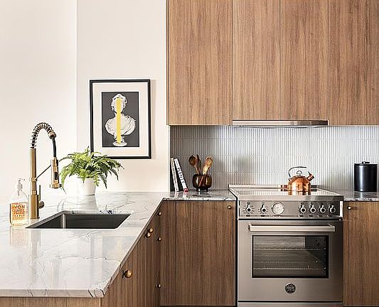 Custom kitchens are a true highlight of each residence, featuring double-height walnut cabinetry, elegant honed Carrara marble countertops, and a distinctive white handmade finger-tile backsplash. Fully equipped with top-of-the-line Bertazzoni appliances, these kitchens blend a distinctive transitional style with performance features, perfect for cooking and entertaining. The bathrooms are designed with an equal attention to the contemporary treatment of timeless and historic materials; unique oversized penny tiles—terracotta in the primary bath and navy blue in the second—paired with classic subway tile walls. The oversized walnut vanities with marble tops offer a sumptuous touch, elevating each