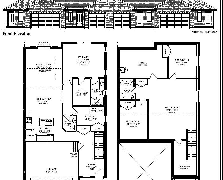 Duvanco Homes signature exterior townhome. 2 bedroom unit includes premium laminate flooring throughout an open concept living space. Porcelain tile flooring in bathrooms and laundry. Your choice of granite or Quartz counter tops in kitchen, soft close cabinetry featuring crown moulding, light valance and under cabinet lighting. This kitchen design includes a corner walk in pantry! 9' main floor ceilings and our living room features vaulted ceilings. Primary bedroom offers plenty of privacy with spacious en-suite that includes tiled step in shower with glass surrounding. Attached 2 car garage fully insulated, drywalled and primed. Full brick exterior, asphalt driveway with precast textured and coloured patio slab walkway. Yard fully sodded and pressure treated deck with 3/4 black ballusters. Finished basement includes rec room, 4pc bath and 2nd bedroom. All Duvanco builds include a HOLMES APPROVED 3 STAGE INSPECTION at key stages of constructions with certification and summary report provided after closing.