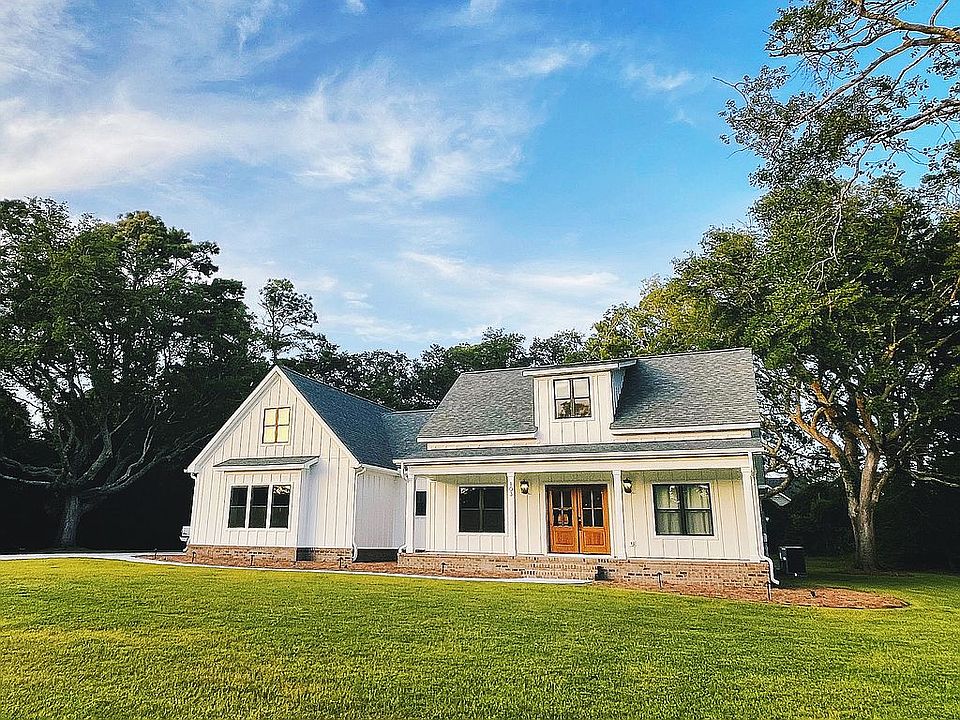 Farmhouse style beach cottage with open floor plan, custom finishes, mahogany front doors, matte black windows, Hardy siding, luxury-vinyl plank flooring, stainless appliances, private guest area on just under an acre lined with Coastal Live Oak.