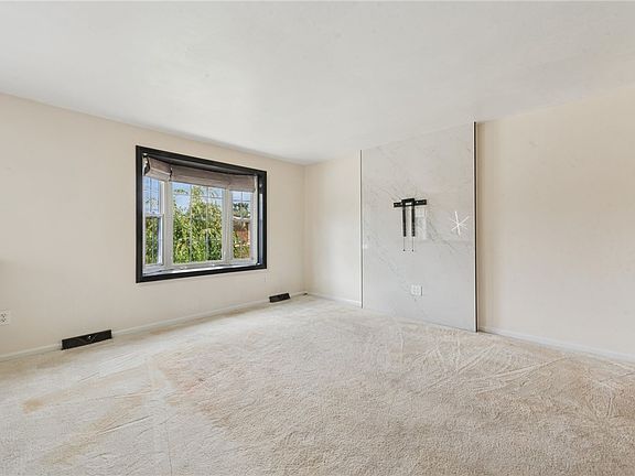 Flat backyardTv mountDark wood cabinetryDead-end streetTile backsplashBay windowFormal dining room