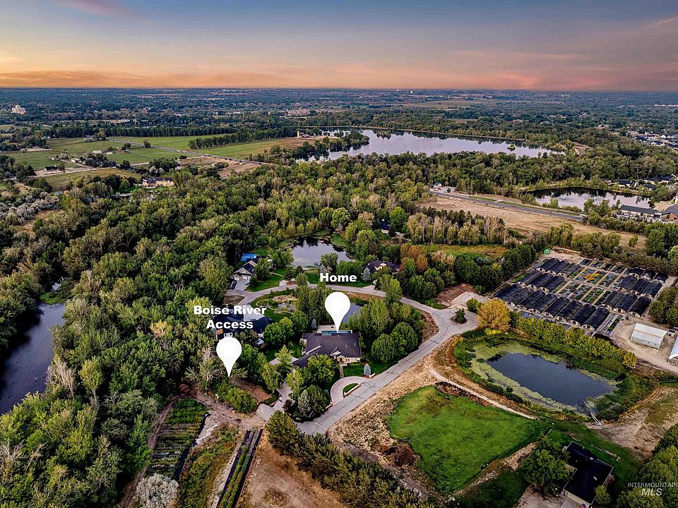 -Luxurious Sanctuary with River Access & Resort-Style Living--Discover 103 S. Alder Lane, a rare estate tucked away on ONE acre with pond frontage and Boise River access. This spacious single-level home with bonus room offers fresh interior paint, refinished hardwood floors, and soaring ceilings that create a warm yet sophisticated feel. Designed for flexibility, it features dual master suites ideal for multi-generational living or extended guests. The gourmet kitchen opens to a generous great room with serene backyard views, while a dedicated media room and large bonus space above the garage add even more options for work or play. Outdoors, enjoy resort-style amenities including a ~3,000 sq/ft patio, 20’x50’ heated saltwater pool, built-in kitchen, and firepit overlooking the water. A massive 6-car garage provides ample space for vehicles, toys, and storage. One-of-a-kind entertainer’s dream located in one of Eagle’s most sought-after hidden settings-without restrictions of an HOA.