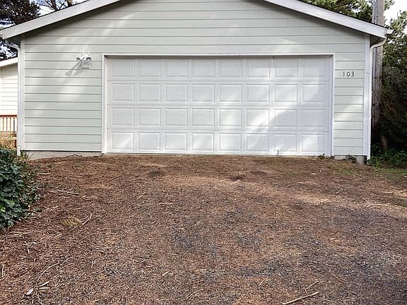 The oversized garage/shop features roll-up doors on both sides, offering plenty of workspace, storage, or hobby space. The large mature yard adds privacy and serenity, ideal for coastal living.