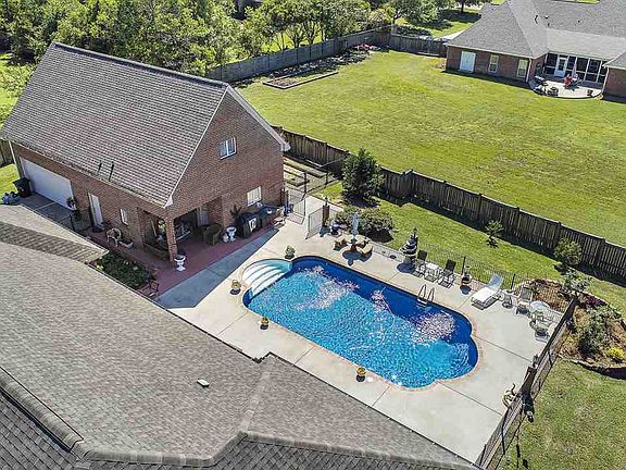 Exceptional 4300 +/- with separate ofifce plus four car garage, pool 6/5.1! You will not find a comparable property in this price range in Madison County. This property offers unbelievable amenities not found in Madison County. ALL bedrooms on MAIN FLOOR except 6th bedroom/bath or bonus or gameroom on second floor. There are two true master suites, one on each side of the house. The elegant foyer prepares you for the grand living spaces and natural light as you enter. Twelve foot ceilings with expansive crown molding and plantation shutters accent the quality throughout this home. Hardwood flooring, custom builtins and fireplace accent the grand family room. A formal dining room has been transformed to a formal living room for added enjoyment. The large kitchen with granite countertops, white subway tile backsplash, stainless appliances and custom made pantry door will make all food preparation and cooking enjoyable. The expansive sunroom with white brick walls can be accented with your own personal color palet, while the floor to ceiling windows paint a new picture every day. The view of the pool is calming and picturesque. The main master bedroom has maple wood flooring, trey ceiling, built-in cabinet and large attached bath with walk-in shower, garden tub, vanity area and two separate sinks. The master is topped off with generous sized walk-in closet. Two nice bedrooms share a full bath and the main laundry room is located on this hall. The second master is equal in size to the main master inlcuding brand new carpet, private bath with separate shower and garden tub. An additional bedroom and half-bath is located along this hall with a stair case that leads to the sixth bedroom and full bath upstairs. The downstairs is complete with an office area off of the garage entrance. Outside you will find a lovely pool with an enclosed patio area surrounding the pool. The pool house/guest house holds all of the pool equipment, an additional two car garage, work bench and shop or exercise area. A full bath and office area are conveniently located on the ground floor. There is a 900 sq ft apartment/office/pool room upstairs with an efficiency kitchen, built in bunk bed and TONS of storage. Behind the pool house is a separate area with raised garden beds for your spring and fall planting. Extensive entertainnng outside. The lot is a little under an acre while affording you most any lifestyle imaginable. Two separate driveways for each garage and a hand painted shuffle board court in the back. A fabulous property offering lifestyles for today's families. For your private tour, please call a Realtor today. Agent is related to owner.