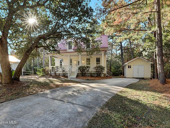This Allison Ramsey cottage style floor plan of 1653 sq ft, 3 bedrooms, 2.5 bath, is situated in the cul de sac. Located in the sought after gated community of Pelican Reef. Owners' bedroom on the first floor and 2 guest bedrooms on the second floor with a loft/sitting area in between at the top of the stairs with wood flooring. Home backs up to woods. Marble countertops in the kitchen with maple cabinets. Metal roof, wood burning fireplace, and upstairs bathroom tiled, and some carpet in bedroom closets. LVP flooring in the laundry room, kitchen, dining room, living room, hallway, half bathroom, and owner's bathroom. Walk in the attic for storage. 10X10 Screened on the porch. Clear some more property for fencing per the HOA guidelines for more backyard. Crawl space is enclosed and insulated. Interior painting negotiable. Community amenities included are pool, fitness area, clubhouse, playground, kayak launch area, RV/Boat storage (upon availability; inquire with HOA), and walking pier on Virginia Creek. Tennis is also available with additional membership (inquire with HOA on those fees). A short drive to the town of Surf City and Topsail Island beaches as well as the Pender County public boat ramp to access the Intracoastal Waterway. Good school district. Buyers to verify schools.