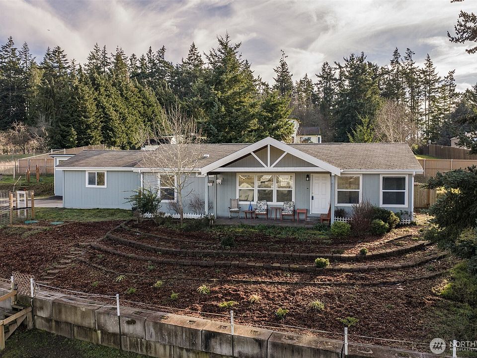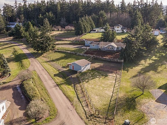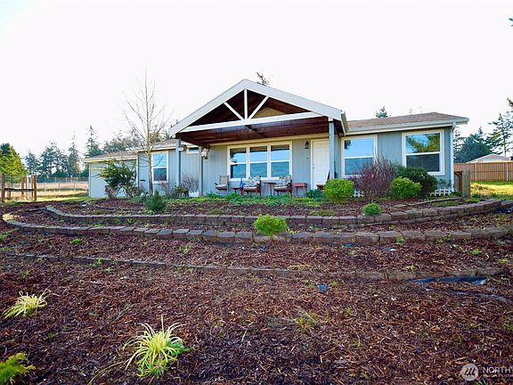 Beautiful & bright home with extensive upgrades & vaulted ceiling. Spacious, open concept 2 bd, 2 ba home. Kitchen has large breakfast bar & walk-in pantry. Ex space for office/den. Desirable layout has split floor plan with primary adjoining bath & walk-in closet. Guest bedroom & bath. Sit on the large, covered front porch & enjoy the view of the valley below, amazing sunsets & wildlife. Separate studio/shop is insulated with power. The fully fenced property includes barn/stable for animals, pasture, chicken coop & run. Quiet country living in friendly neighborhood, close to town & Dungeness Wildlife Refuge with scenic trails & beach access.
