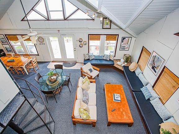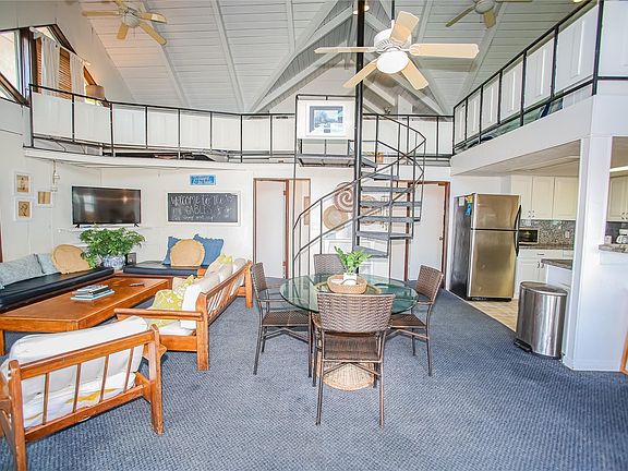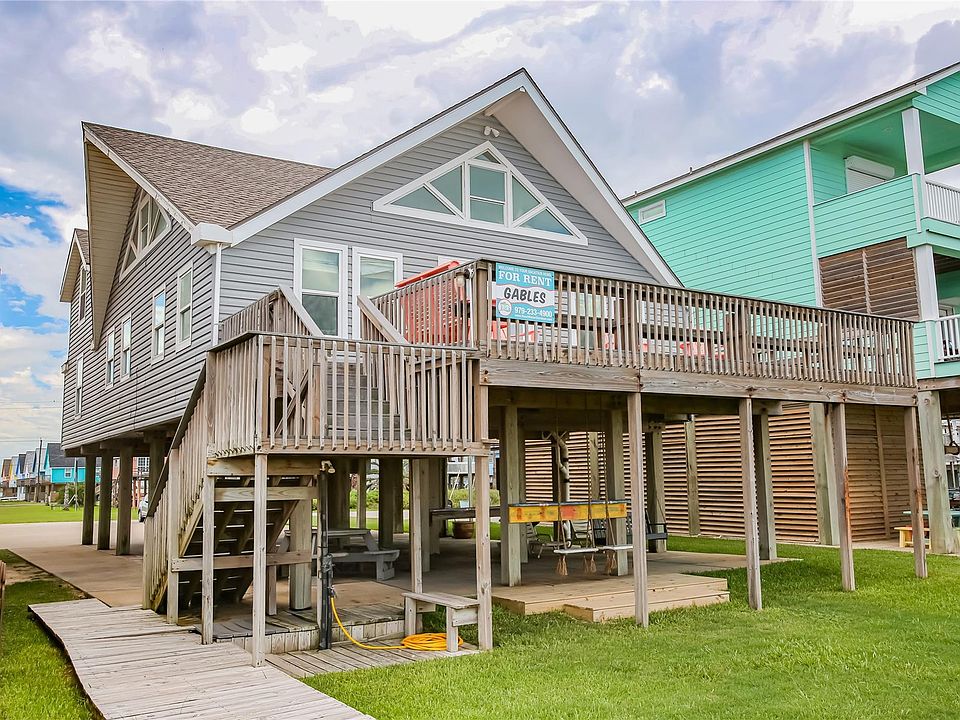 Welcome to The Gables, an iconic Gulf-front retreat in Surfside Beach. This 4-bedroom, 3-bath home blends vintage charm with modern comfort. The main level offers spacious king and queen bedrooms, two full baths, and an open living area with vaulted ceilings. A spiral staircase leads to the loft, featuring flexible sleeping areas, a lounge, and a third bath. The expansive beachfront deck showcases panoramic Gulf views, perfect for sunrises and moonrises, while the shaded ground level provides storage and swings for outdoor fun. Roof replaced in 2021. Conveyed fully furnished, including appliances, this home is turnkey and ready for immediate enjoyment or vacation rental income.