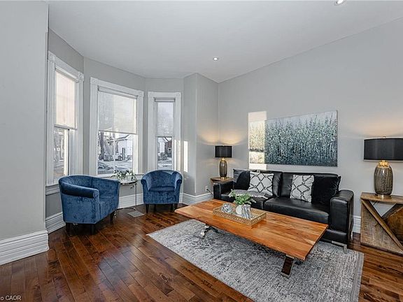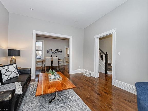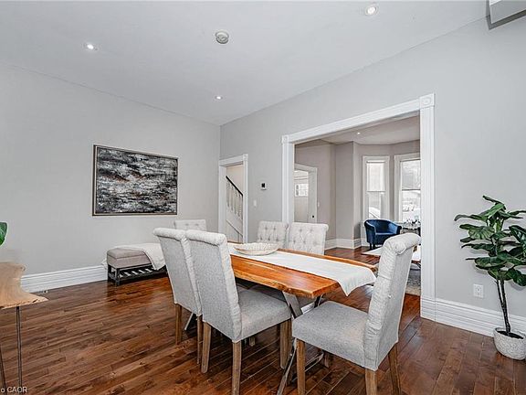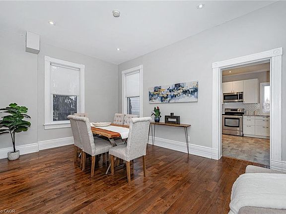 Welcome to 103 Surrey St E, a beautifully renovated century home nestled in one of Guelph's most desirable locations, just a short stroll from the vibrant downtown! This 3-bedroom gem is the perfect blend of historic charm & modern updates! Upon entry, you're greeted by a bright & airy living room, featuring solid hardwood floors & multiple windows that flood the space with natural light. The living room flows effortlessly into a spacious dining room, ideal for hosting family gatherings or dinner parties with friends. The eat-in kitchen is a showstopper with fresh white cabinetry, a beautiful backsplash & stainless steel appliances. The charming wainscoting adds character & direct access to the deck makes outdoor entertaining a breeze—perfect for BBQs with friends & family. Upstairs, you'll find 3 spacious bedrooms, all with hardwood floors, high baseboards & large windows that invite abundant natural light. The modern 3-piece bathroom features a sleek vanity & convenient stackable laundry. With room to add a 4th bedroom & zoning that allows for future possibilities, this home offers incredible flexibility! The property also includes a detached garage at the back, perfect for additional storage or parking. The home has been mechanically updated, including a newer furnace, wiring, windows & plumbing, along with cosmetic upgrades such as the kitchen, bathroom & flooring. This property’s location is unbeatable. It’s just a short walk to downtown Guelph offering an array of restaurants, boutique shops, nightlife & more. For commuters, the GO Train station is within walking distance. You’re also just steps away from the University of Guelph, making it ideal for students or parents of students. Local gems like Sugo on Surrey & Zen Gardens are at your doorstep!