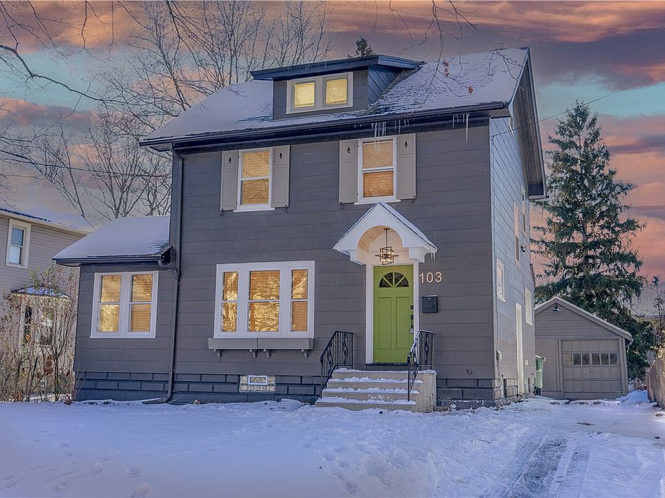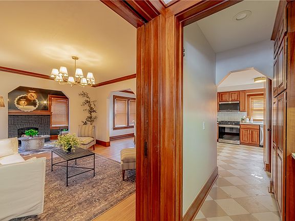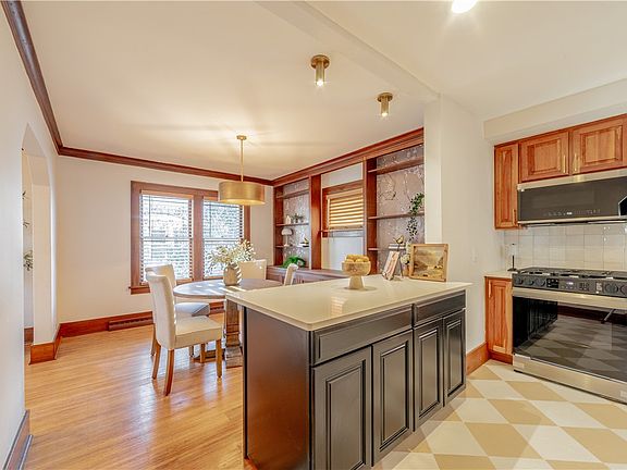 This beautiful residence features three spacious bedrooms, two full bathrooms, and a convenient half bath. The master suite on the third floor provides a private oasis, while the second-floor laundry ensures practicality for everyday living. The natural woodwork throughout the home is in remarkable condition, with charming built-in cabinets in the dining room and original windows showcasing elegant natural wood trim.