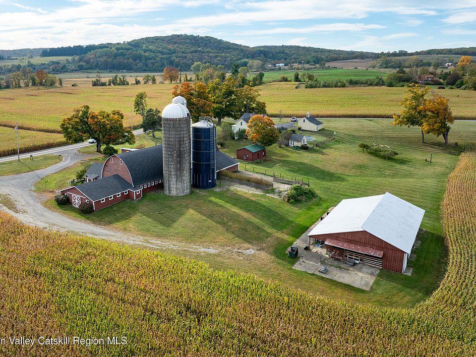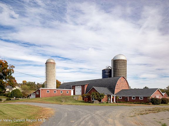 Outdoors, the property is a dream for anyone seeking a Hudson Valley farm property, hobby farm, or equestrian estate. A massive steel barn—ideal for an indoor riding arena, workshop, or equipment garage—complements a traditional dairy barn with hayloft, multiple workshops, office space, and machine storage. A tranquil spring-fed pond adds beauty and utility to the open, rolling landscape.