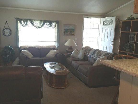 MOVE-IN READY*Pristine Classic! This 3 Bedroom 2 Bath 1248sf 1986 is loaded with upgrades. Cluster floor plan w/living,dining, laundry in front & bedrooms, bathrooms in back.Home features dual pane windows,granite counter tops in kitchen and baths.Copper plumbing, NEWER jack stands,water heater,a/c compressor, interior paint. Home is painted, textured, painted drywall on walls and ceilings. Ceiling highlighted w/crown molding. Mirrored wardrobe in bedrooms. Ceiling fans in most rooms. Vinyl flooring in kitchen,utility and bathrooms. Carpet in rest of home. Kitchen drawers were rebuilt with original fronts remaining.Formal dining area accommodates kitchen and living room. Tall breakfast bar. Galley style kitchen with upper and lower original cabinets. Large corned all fenced lot.