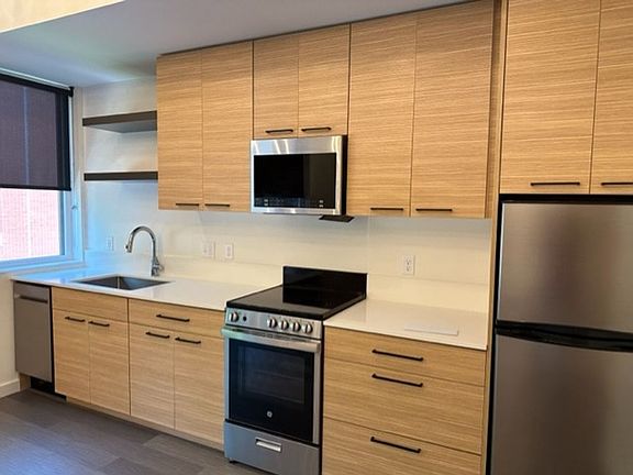 Stainless steel appliancesLarge closetStylish sliding barn door
