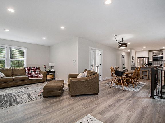 The open-concept layout flows seamlessly from the kitchen into the dining area, cozy sitting room with sliding glass doors, and a spacious great room filled with natural light from expansive windows. The main-floor primary suite provides a luxurious retreat, complete with a modern dual-sink vanity, a walk-in tiled shower, and generous closet space. A stylish half bath is conveniently located just down the hall, perfect for guests.