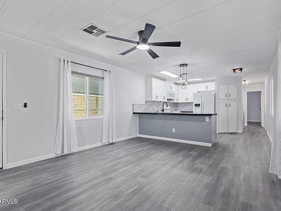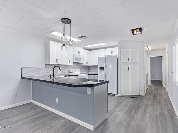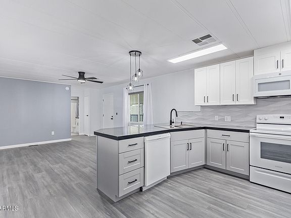 Beautifully remodeled home with TONS of brand NEW items!! Outside you will find a brand NEW HVAC with warranty, brand NEW energy efficient thermal pane low-e vinyl windows, brand NEW 20 year roof coating, NEW vinyl skirting, and fresh NEW paint. Inside you will find all NEW built in appliances with warranty, brand NEW subfloor and NEW laminate flooring, brand NEW modern light fixtures, and NEW LED Energy star lights and fans. The kitchen offers brand NEW counters with a NEW stylish backsplash, and brand NEW cabinets. Both bedrooms are split for extra privacy, and both bathrooms include a brand NEW tub/shower combination. Outside, you'll find a covered patio, a storage shed, and a carport space. This friendly 55+ community awaits you! See doc tab for full list of brand NEW items!